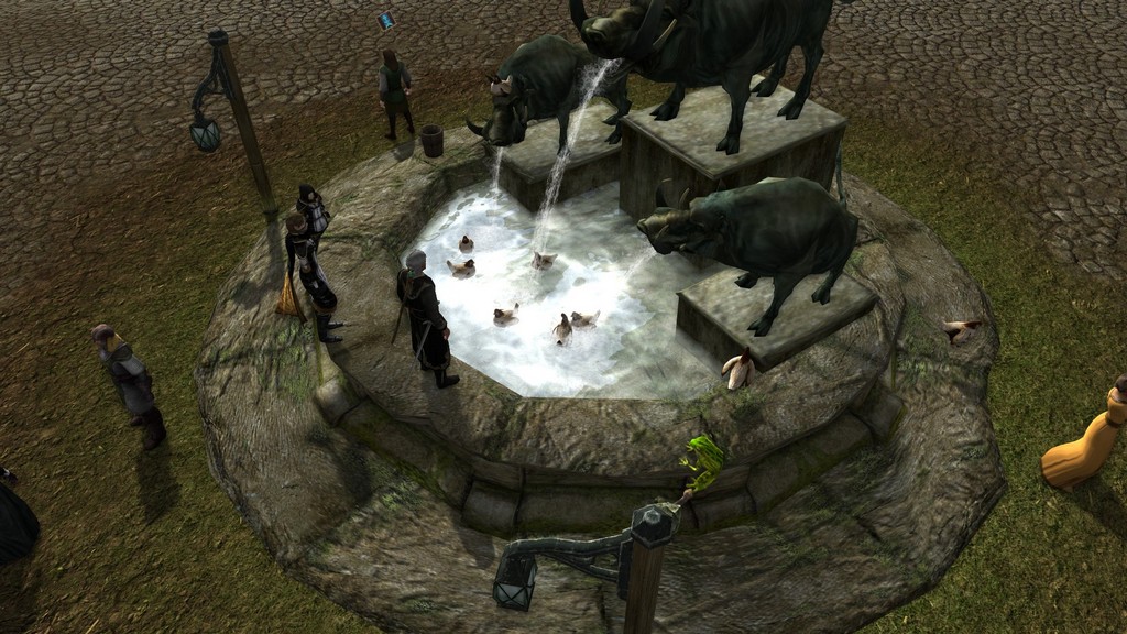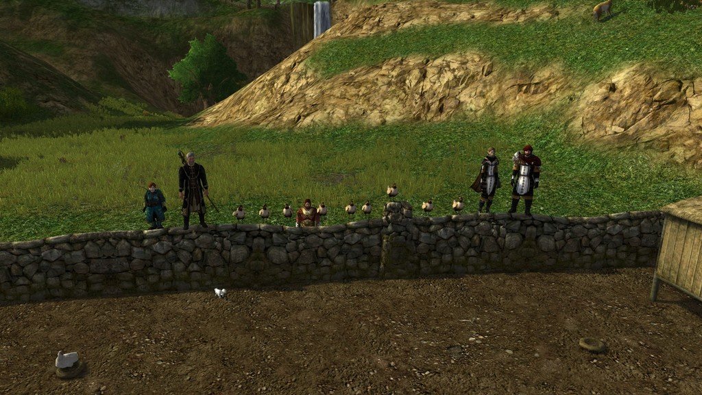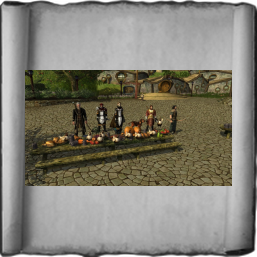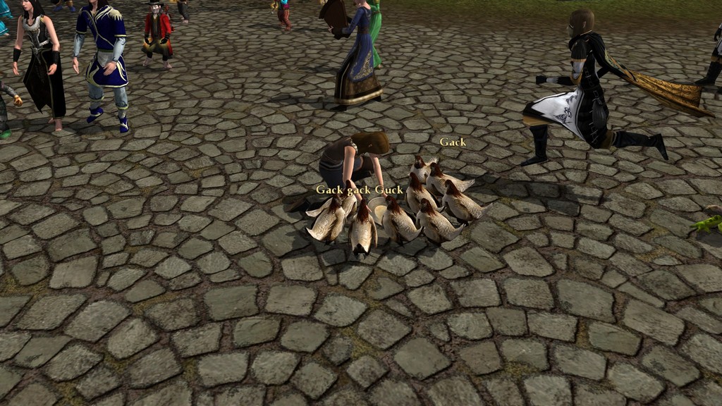 Mit reichlich Hühnern und einem Geleitschutz ging es nach Bruchtal. Natürlich wurde auf dem Weg dorthin mal wieder Bree eingenommen. Die Rollenspieler vor dem Tänzelnden Pony wurden von den gackernden Hühnern überrascht. Zur Feier unseres Sieges ließen wir uns dort sogar füttern. Die Hühner natürlich...^^